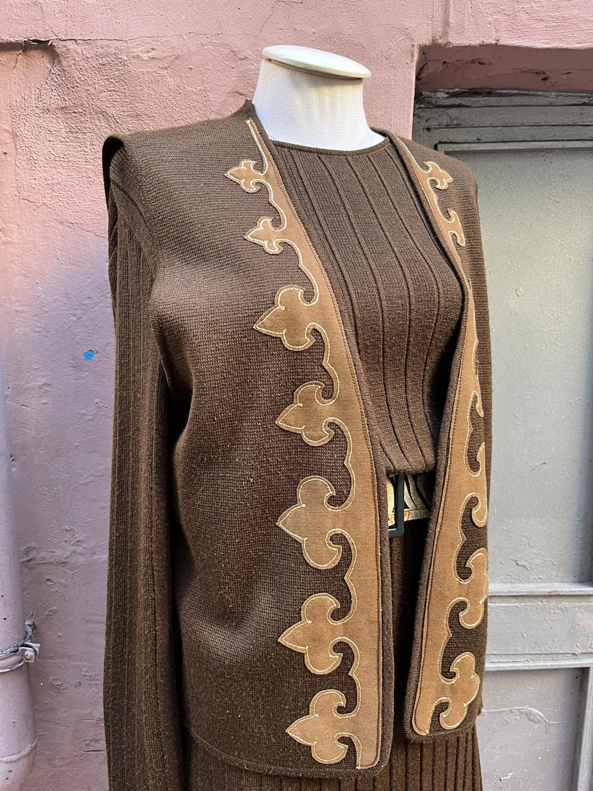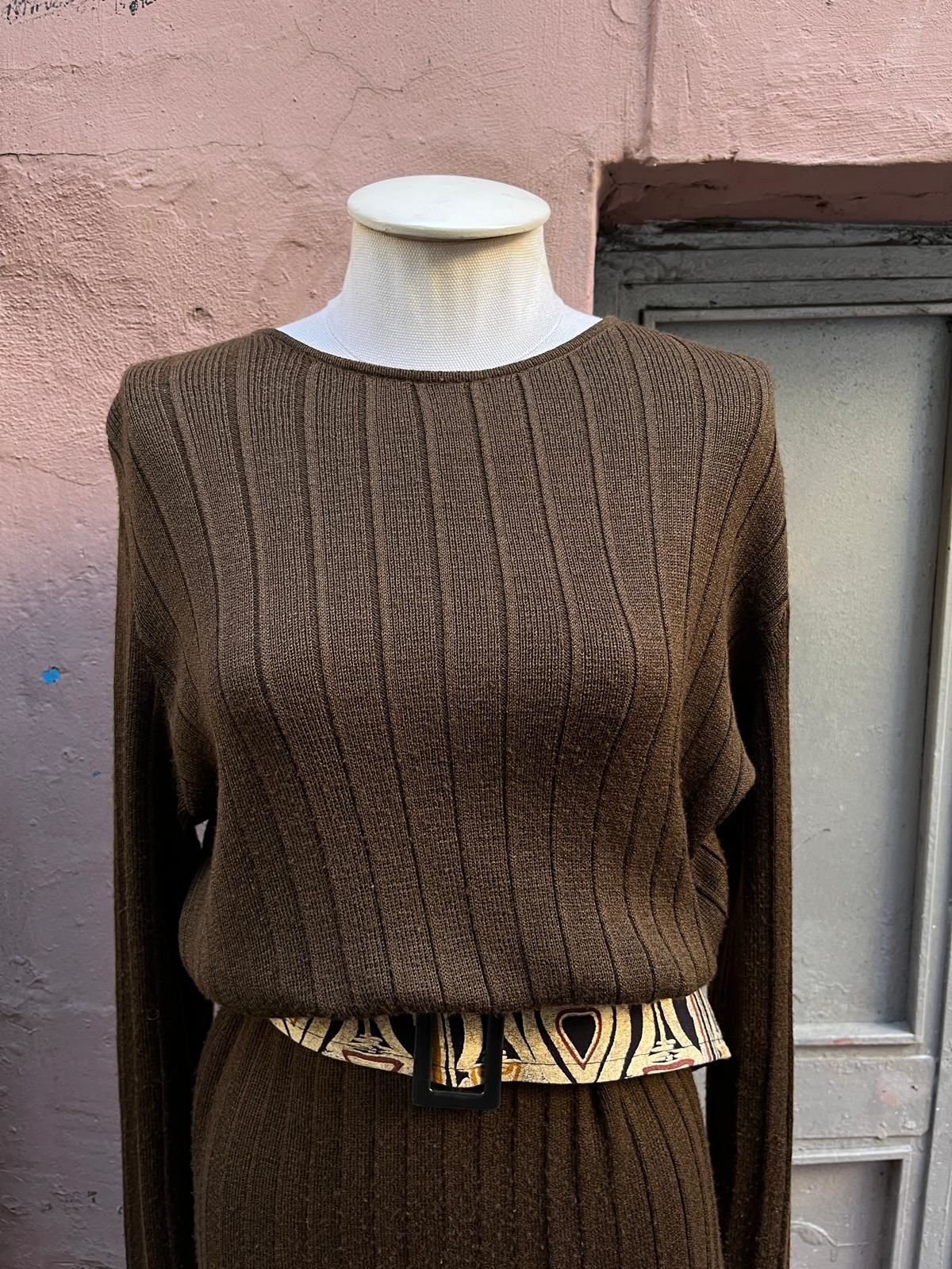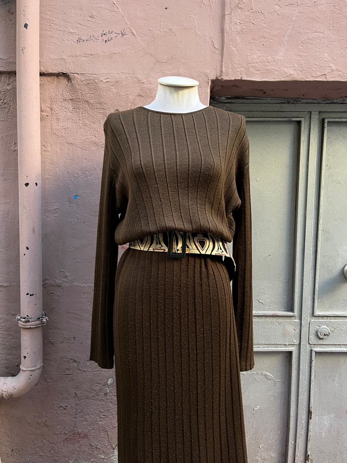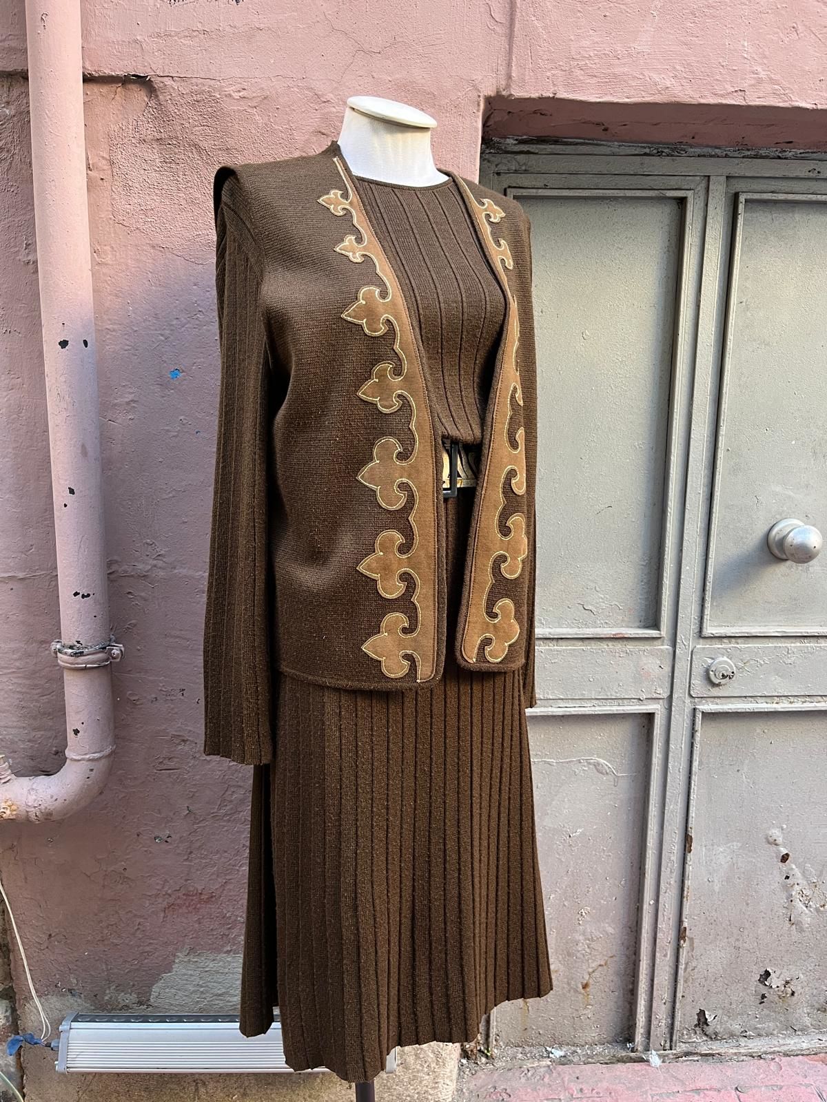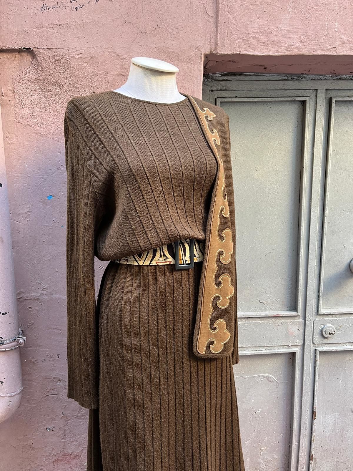 1980'li yıllar üretimi takım iki parçadan oluşmaktadır. Kumaşı örmedir. Elbise, medium beden giyenlerde oversize görünüm oluşturacaktır.