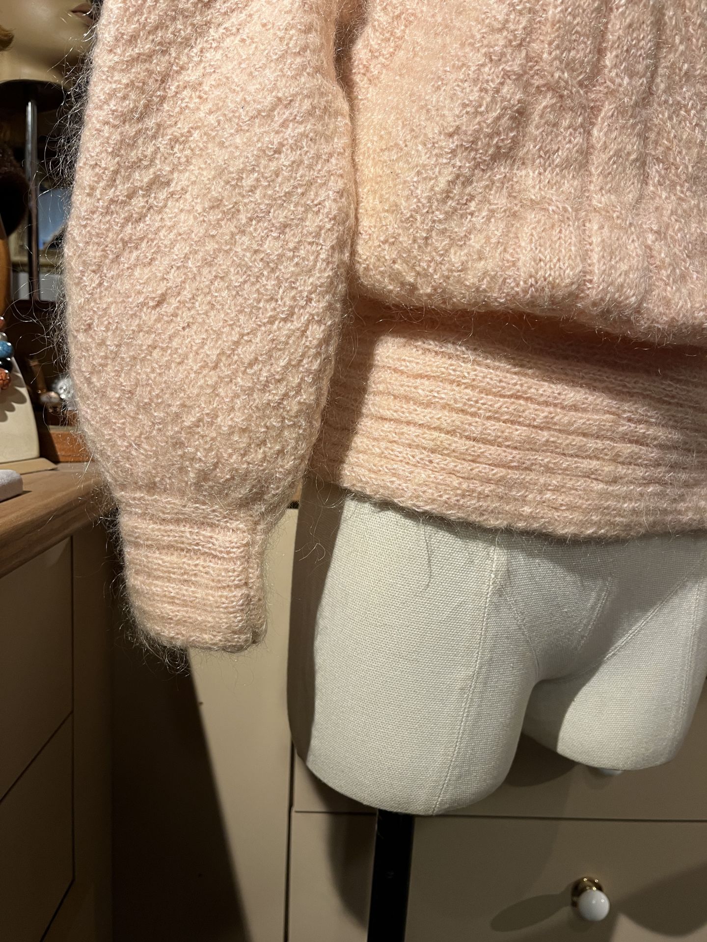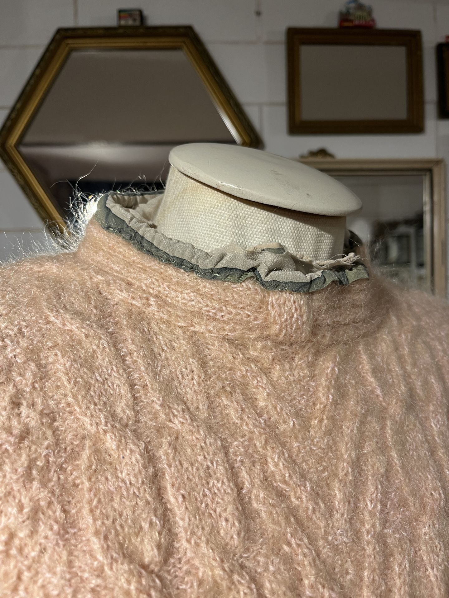 İpek yaka detaylı, el örgüsü mohair kazak.