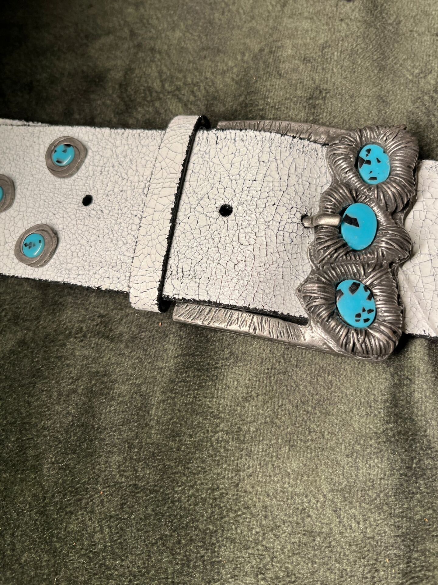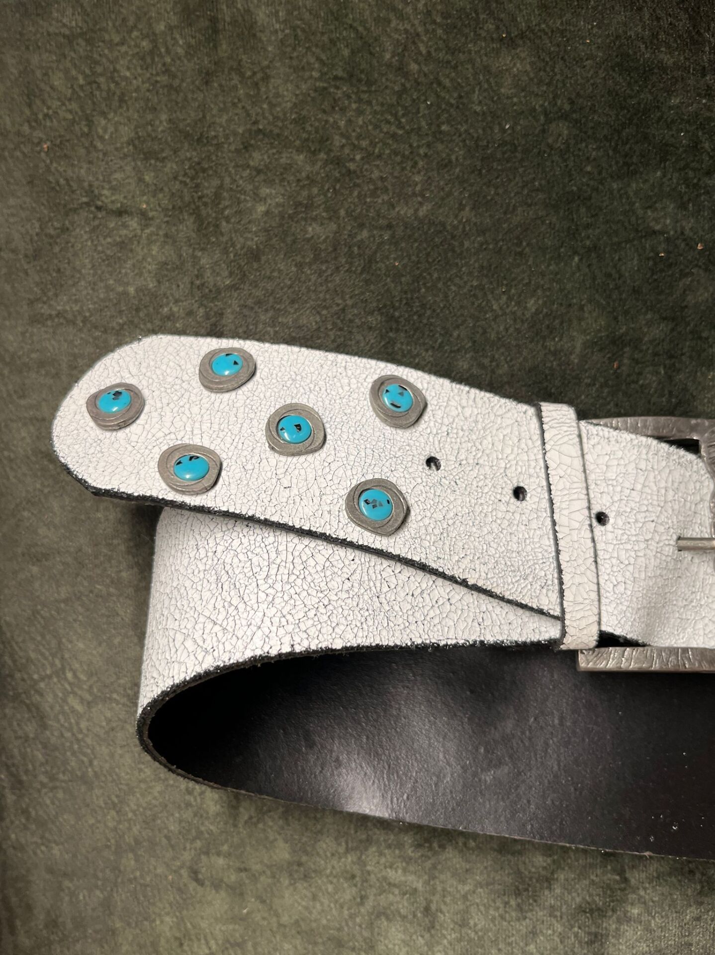 Turkuaz taş detaylı, eskitme görünüm verilmiş hakiki deri.