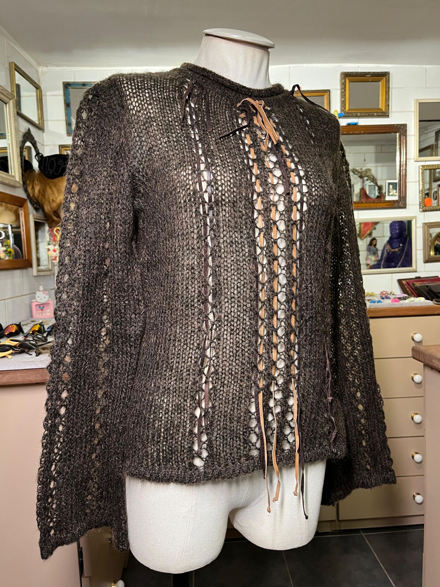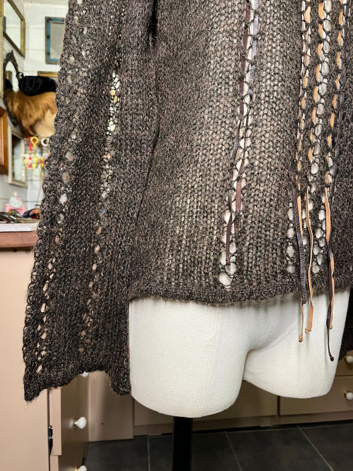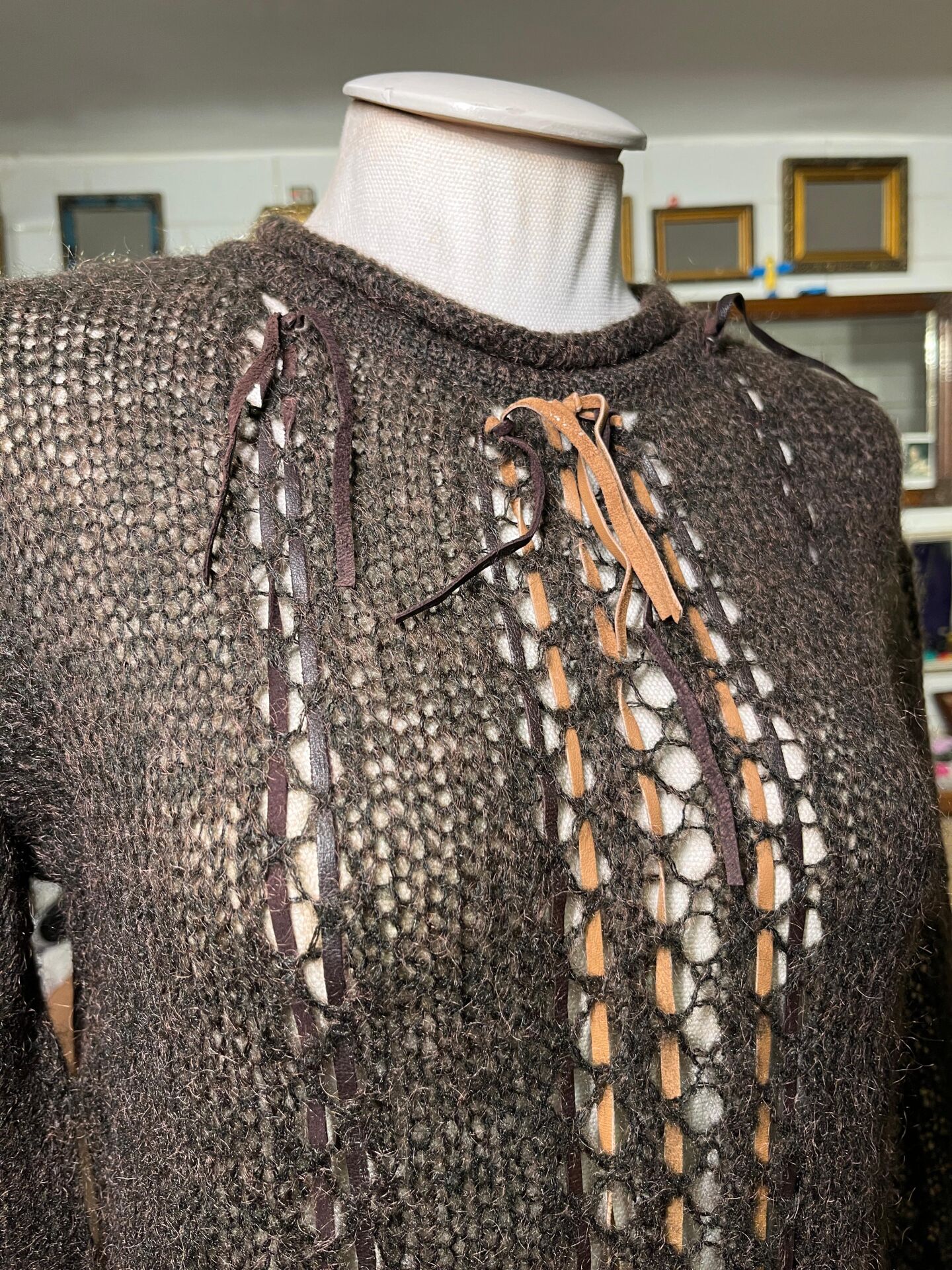 el işçiliği hissi veren yün file dokusu deri bağcıklarla süslenmiş.